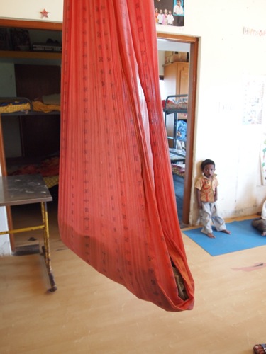 古いサリーが天井から吊るされている。中をのぞくと赤ちゃんが。ゆりかご代わりである。そういえば、ムンバイのバス停で、やはりホームレスの女性がこうやって、古いサリーに赤ちゃんを吊るしていたのを思い出す。