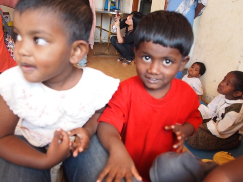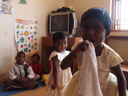 大半の子どもは学校に行っているが、小さな子供たちが何名か、残っていた。ちなみにカルナタカ州の公立(州政府運営)の学校は、以前も記した通り、非常に環境が悪いとのことで、私立に通わせているという。