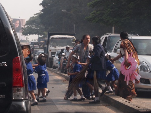 久しぶりに助手席に座るとまあ、渋滞の激しさ、悪路のすさまじさが肌身にしみる。園児を引率する保母さんたちも、命がけだ。