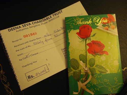 本日、バンガロール市街北部に位置する慈善団体DEENA SEVAを訪れた。ここ数回分のチャリティ・ティーパーティで集められた寄付金24,000ルピー、及び寄付の品々を届けるためだ。