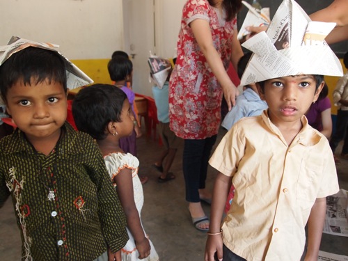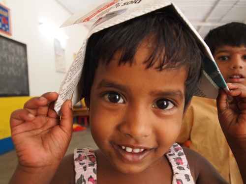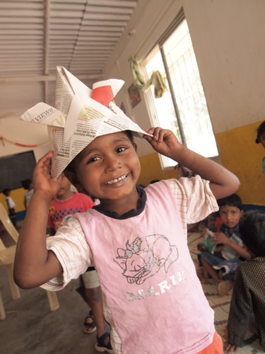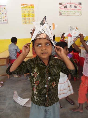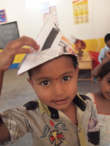 タブロイド判のこの新聞。端の部分を切り取って正方形にしてカブトを作ると、頭が小さめなインドの子供たちにぴったりフィットするのだ。