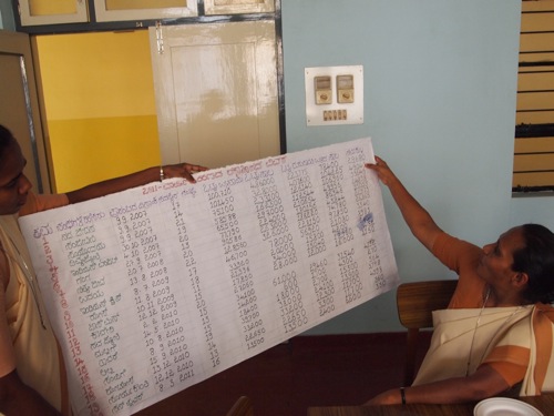 上の写真は、セルフヘルプグループの2011年の活動内容を示すボード。現在325名の女性たちによる合計20のグループが存在。各グループは月に2度集まって勉強会をし、月に1度、100〜200ルピーの積み立てをする。
