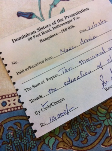 サリーを着た彼女がジニ。右上は寄付金の領収書(10,000ルピー)。