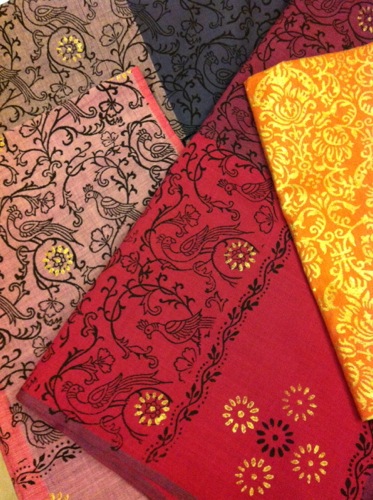 わたしが特に気に入ったのは、左上のストール。クジャク柄のそれらは、木綿製で、布そのものはツートーンカラーになっている。