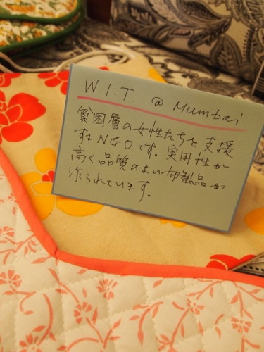 以下の写真は、ムンバイで仕入れて来た工芸品の数々。ティーコージーや鍋つかみ、ポットのハンドルつかみなど、実用性の高い商品が豊富に揃っている。