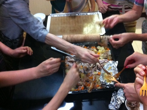 料理はどれも、みなさんに試食していただいた。これは、丸ごと鶏肉のグリルに伸びる試食の手! 他の料理は一応、小皿を用意したりしたのだが、この料理はもう、面倒になってワイルド状態。