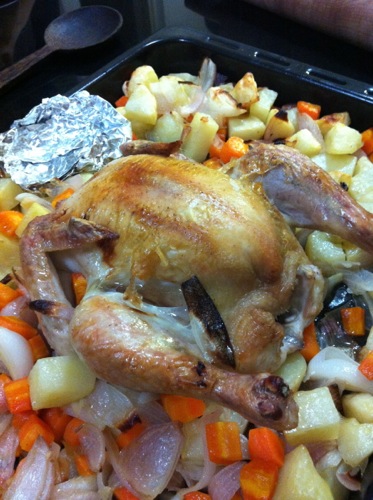 以上を約220℃に熱したオーヴンに入れて40〜50分ほど焼くだけ。途中で数回、野菜などが焦げ付かないように、適宜、野菜を混ぜる。