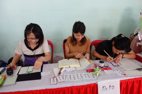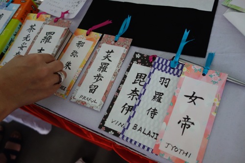 昭和の事務員。のような風情で黙々と作業をするのは、書道のデモンストレーション。去年も好評だった、「名前を漢字(当て字)にして書くという企画。これがまた、大人気。