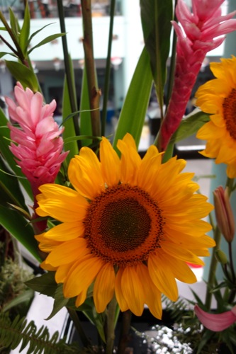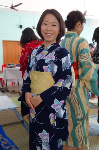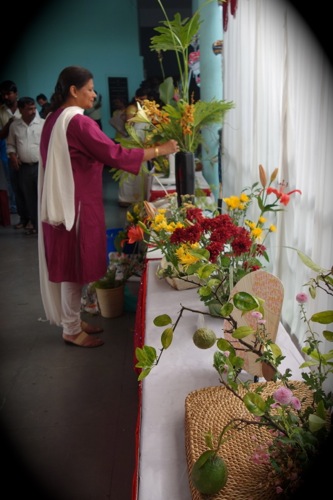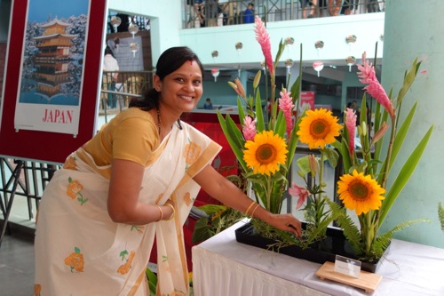 こちらは小原流生け花の展示の様子。わたしの大好きなヒマワリの花を行ける女性。彼女の笑顔がまた、ひまわりのようで可愛らしい。バンガロールではほとんど見かけないので、ひまわりをどこで買い求めたのかと尋ねたら、ガーデナーがどこかから持って来てくれた、のだとか。
