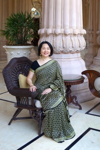 ランチの開催場所は、市街のホテル、リーラ・パレスのカフェにて。サリーがよく似合う内装である。
