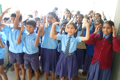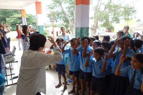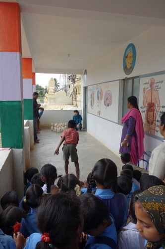 一番広い教室の鍵を持っている先生が不在とかで、やむなく廊下を使用することになったがゆえの、この状況。これまた、インド的である。このぎゅうぎゅう詰めで動けるかどうか、気にはなったが、ともかくは立ち上がって間隔を空けてもらい、身体を動かしつつの HEAD SHOULDER KNEE AND TOESを。