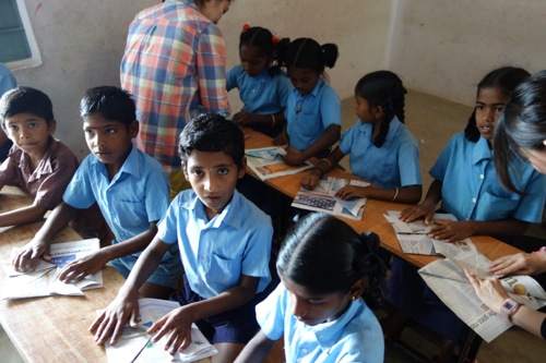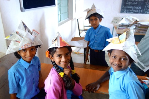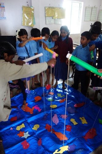 一つの教室では、魚釣りを。なにしろ人数に対して教室が狭いから、子どもたちはひしめき合っている。それでも、奪い合うことなく、交代しながら釣りをしている。先生には、「3匹釣れたら次の人と交代するように伝えてください」と、一応現地語のカンナダ語でも伝えてもらう。