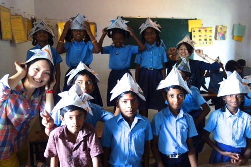 毎度、新聞紙のカブトは子どもたちに喜ばれる。すでに折ったかどうか、大人が一目で判断できるのもよい。3交代で、ほぼ全生徒100名近くに教えることとなったため、正方形に切った新聞紙が足りなくなったようだが、正方形に切ることさえも、子どもたちに教えられれば、とも思った。