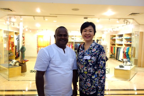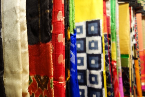 質のよいイカット(かすり)を利用し、デザイナーがオリジナルで「現代風」にアレンジしたというサリーの数々。アートスクールの値段の軽く倍以上はするが、色合わせの妙やデザインの斬新さがユニークだった。