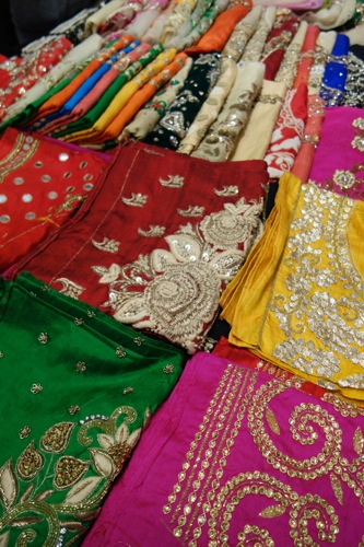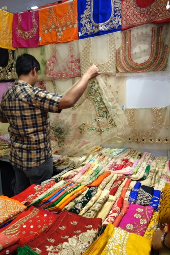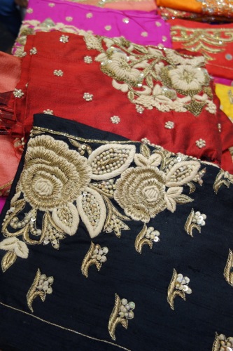 この業者は、コルカタから来たとのことで、一目で手刺繍だとわかったことから、あれこれと見せてもらった。たとえば白やクリーム色、レモン色など静かな色のサリーでも、このように派手なブラウスを合わせれば、たちまち艶やかになる。
