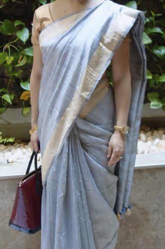 地味ながらも着心地がよく、背筋が伸びる感じがする。夜のパーティなどではまだまだ、華やかなサリーを着たいけれど、昼間の会合などは、このようなサリーをもっと、着てみたいものだと思う。