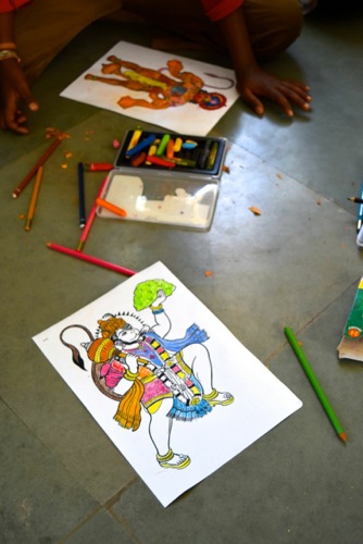 今回は、初めて塗り絵を担当させていただきました。10歳前後の子供たちが、1グループ20名弱、男女ほぼ半数ずつ5つのグループに分かれていて、私達は担当に分かれて、その中の一つに入るという感じで始まりました。美穂さんがダサラに因んで準備して下さったハヌマーンの絵は、男女共に人気でした。男の子はマッチョな力強いハヌマーンを、女の子はソフトな感じのハヌマーンを選んでいました。