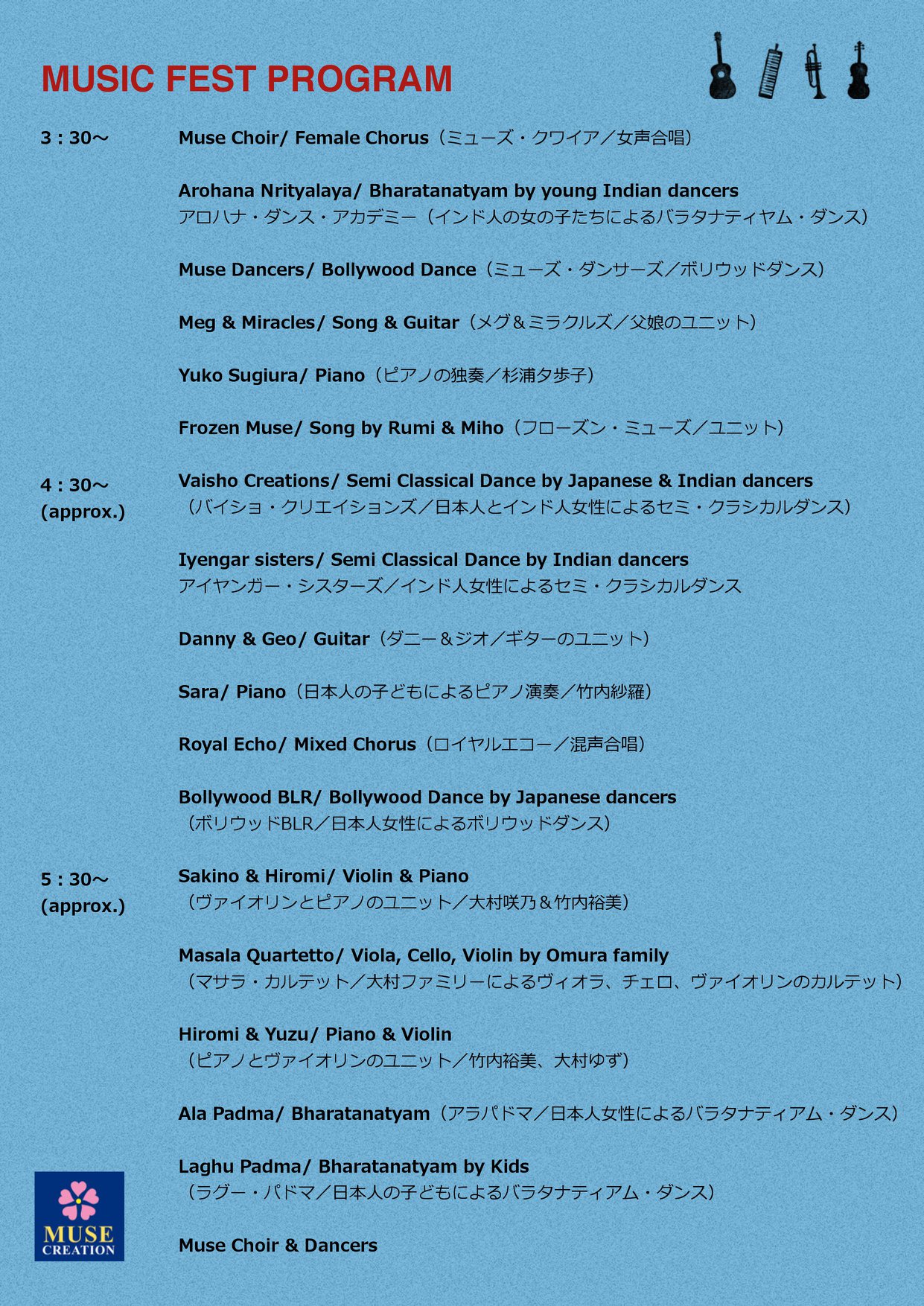 ロイヤルエコーやミューズ・クワイアのコーラス、インドの子どもたち、日本の子どもたち、そして大人による南インドの伝統舞踊バラタナティアム・ダンス、バンガロールのダンスチームやミューズ・ダンサーズによるボリウッドダンス、ギターのデュオ、ピアノの独奏、ピアノとヴァイオリンのユニット、そして4人家族によるヴァイオリン、ヴィオラ、チェロのカルテット、父のギターと娘の歌などなど……。