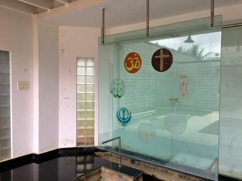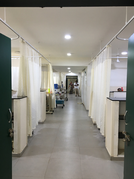 病院の一隅には祈りの部屋、即ち霊安室がある。初めて訪問した時に、その部屋の中を見せてもらった。がらんとしたその部屋の、壁の一隅に、釘が刺されていた。亡くなった患者をこの部屋に導き、それぞれの宗教に応じた神様の額縁を、釘にひっかけて、祈りを捧げるのだという。館内には、なんら宗教を示唆するものは見られないが、ヒンドゥー教、キリスト教、仏教……と、インドで信仰されているさまざまな宗教の、額が用意されているのだとのこと。霊安室の入り口の反対側に、もうひとつ、大きなドアがあった。遺体を救急車に移す際、遺体が建物の中を通過しなくていいように、他の人々の目に触れないようにとの配慮である。