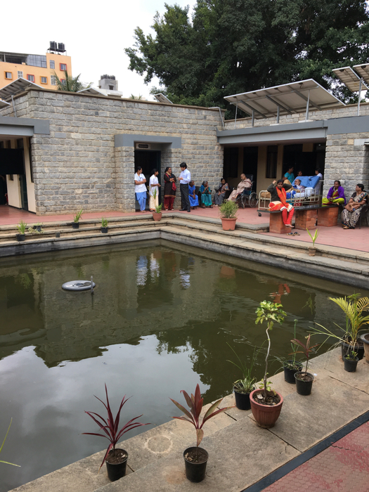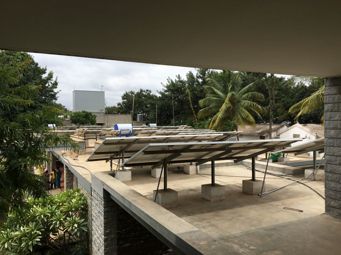 以前訪れた時には工事中だったが、今回は、病棟の屋根一面に、太陽光パネルが設置されていた。State Bank of Indiaにより寄贈されたもので、100%の電力が賄われているという。噴水の水も浄化してリサイクル使用するなど、細部に行き届いた設計であることが伺える。