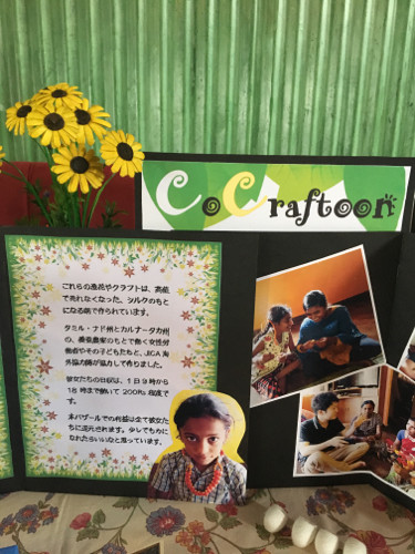 ◎CoCraftoon:養蚕農家を支援する青年海外協力隊スタッフによる繭の小物販売。ミューズ・クリエイションも彼らの作品作りに協力、狭いながらもテーブルを提供した。