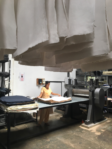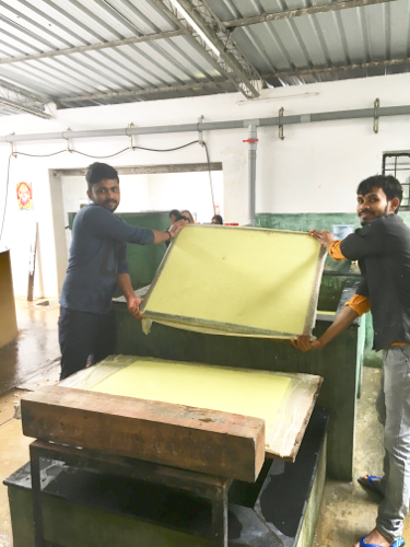 布の切れ端、コーヒー豆の皮、不要な枝など様々な繊維から紙を作る工程は、まだまだ改善の余地があるように感じましたが、インド人男性が紙漉きをする姿や、紙を洗濯バサミで頭上に干して乾燥させている様子には、どこか心があたたまる思いでした。工場全体が穏やかな空間で、カヴヤさんのお人柄によるものかな、とも感じました。