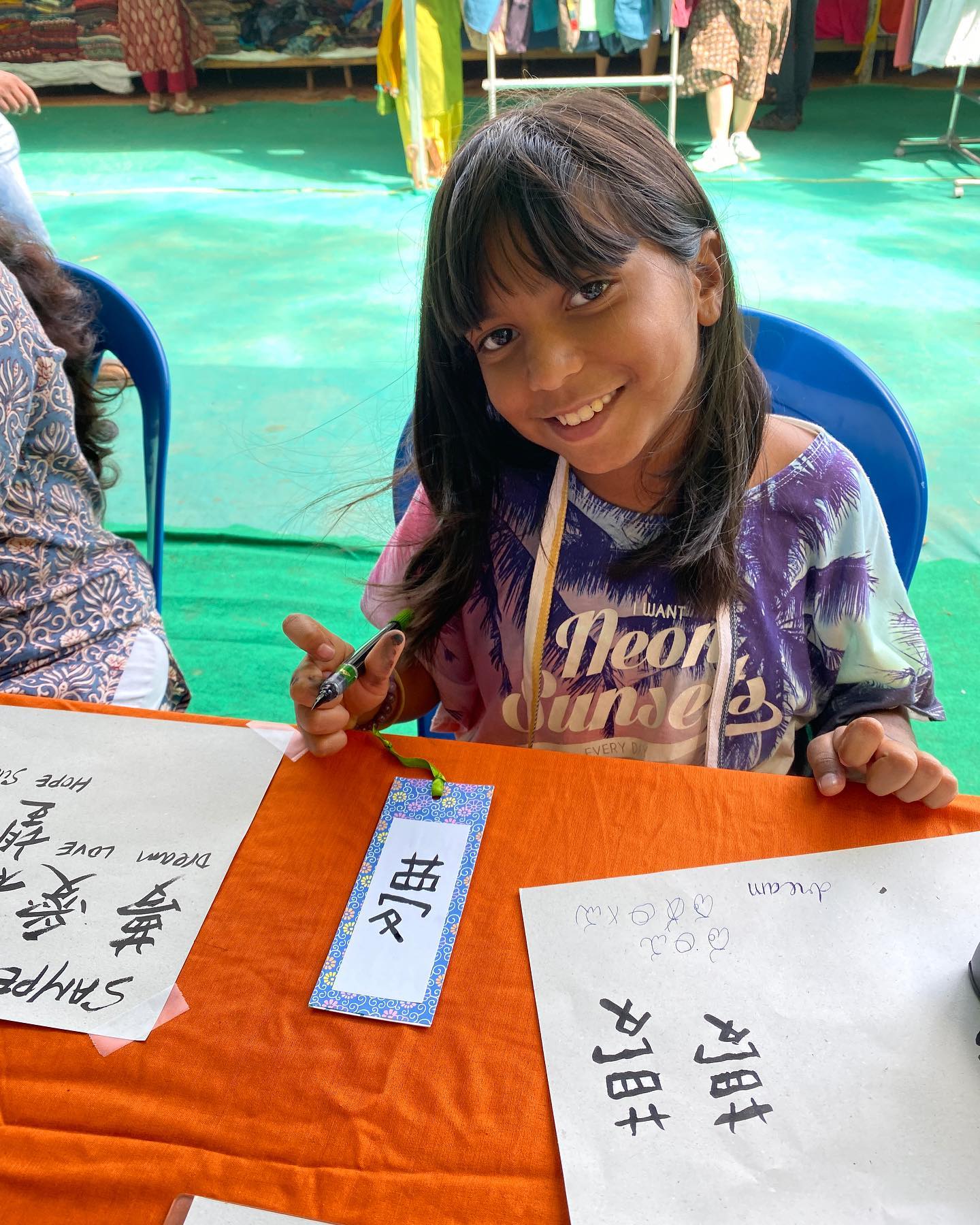 書道と呼ぶにはあまりにもカジュアルな筆ペンにて。しかし自分の好きな言葉を書いてもらうなど、十分に楽しめる。書道短冊はプレゼントに。今回は、名前を当て字にして書くのではなく、名前の意味を尋ねて、それを日本語で書くことにした。サンスクリット語で、「大地」「姫」「富」「繁栄」……。美しい。
