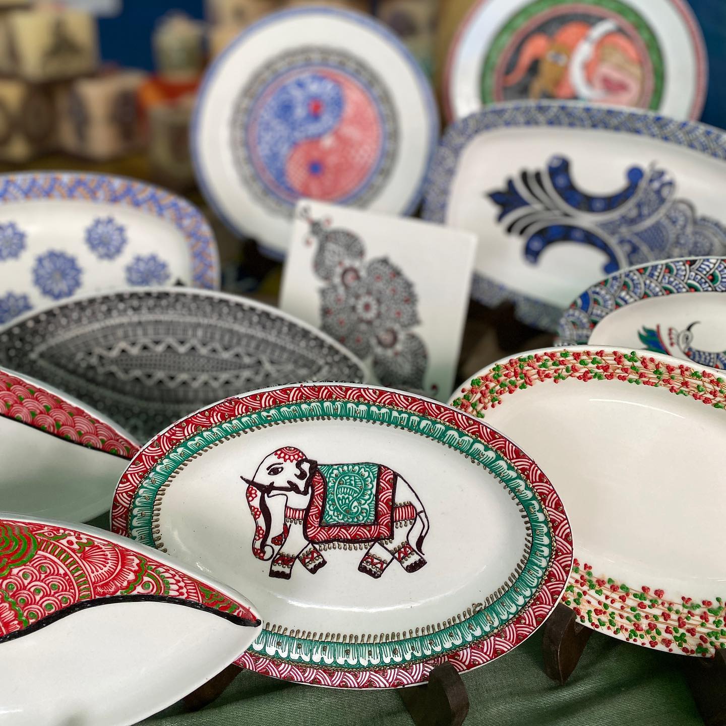 ◎カラフルで精緻なインドの伝統的な文様、モチーフが、陶磁器の上に広がる。