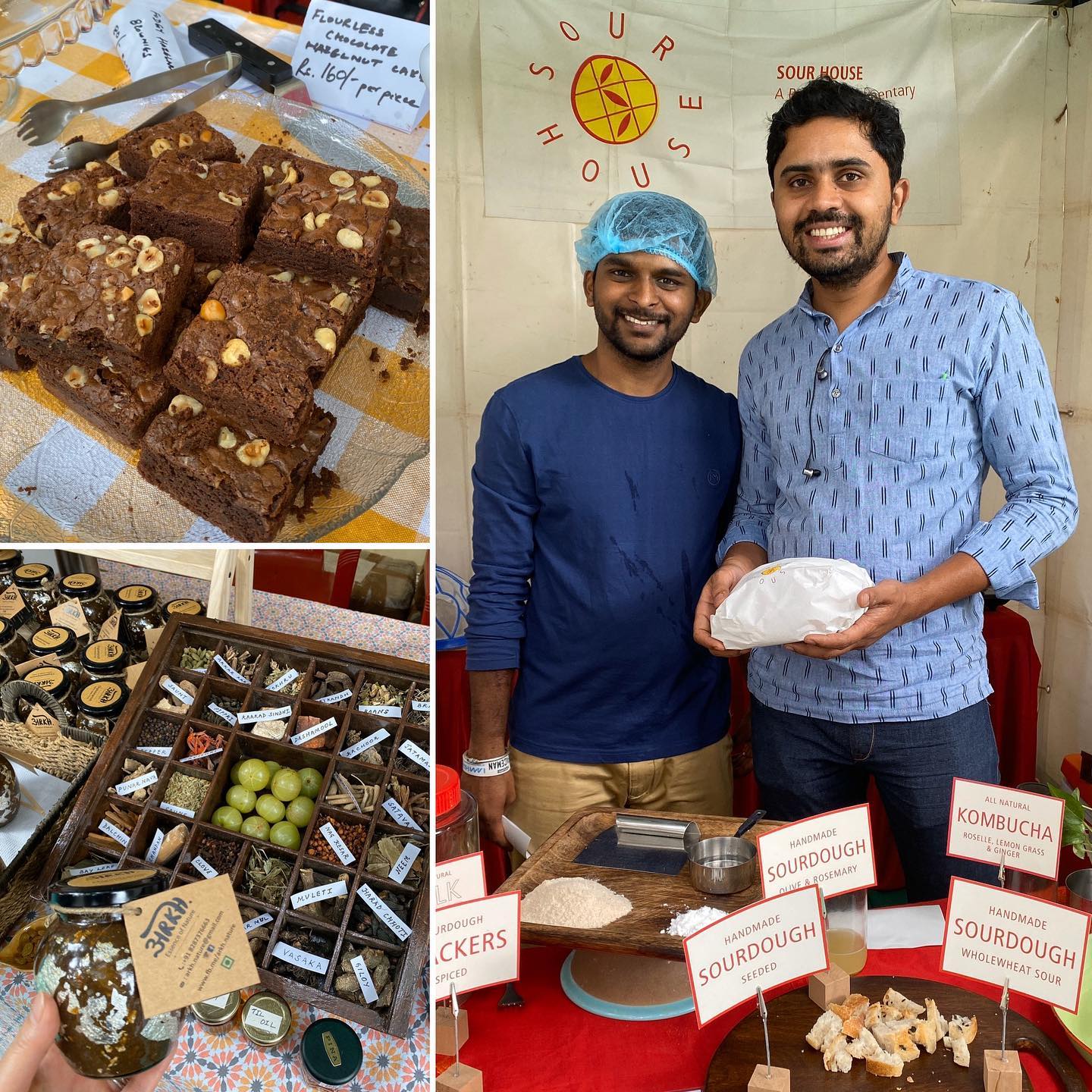 ◎フードコートも充実! わたしは弁当持参で出かけたが、メンバーらは食事を楽しんでいた。コラマンガラのベーカリーでサワードウ・ブレッドを購入。右のお兄さんがオーナー。左下は、アーユルヴェーダの処方に基づいて、写真にあるすべてのスパイスが練りこまれた濃厚ディップ。ひと舐めすると免疫力アップ。というわけで、これもお買い上げ。