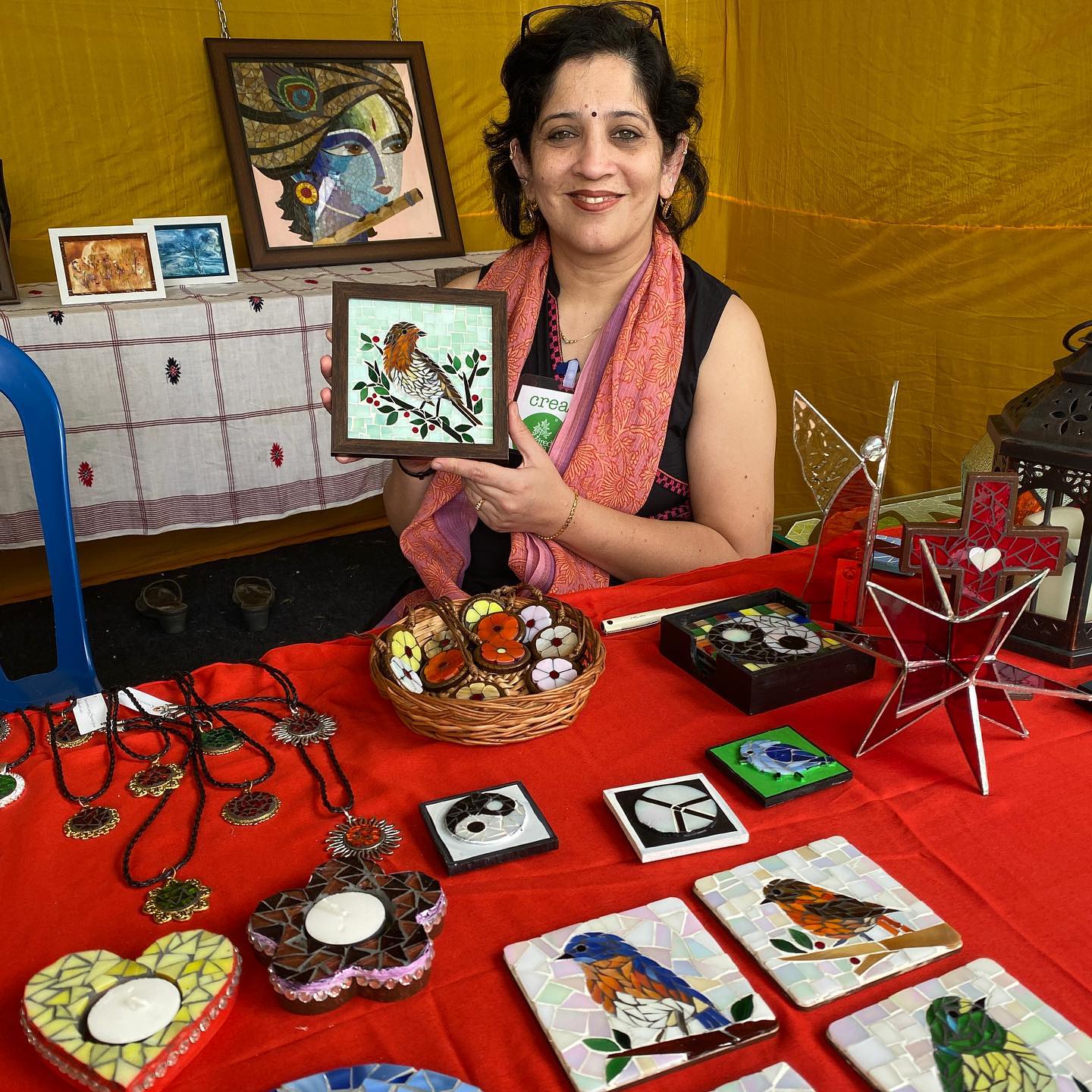 ◎ミューズ・チャリティバザールの常連でもあるヴィドシニのマドゥヴァニ絵画を購入したメンバー。気にいった絵を購入してうれしそう。インドのパペットや伝統絵画には、ピカソのキュビズムを彷彿とさせる技法が見られる。10年ほど前、南インドのタンジョール絵画の先生と話していた時に、そのことを伝えたら「ピカソは、友人に、インドのパペットを贈られたとい逸話があります」と聞いた。真偽のほどはわからぬが、このような絵画を見るにつけ、ピカソの『泣く女』や『鏡の前の少女』を思い出さずにはいられない。