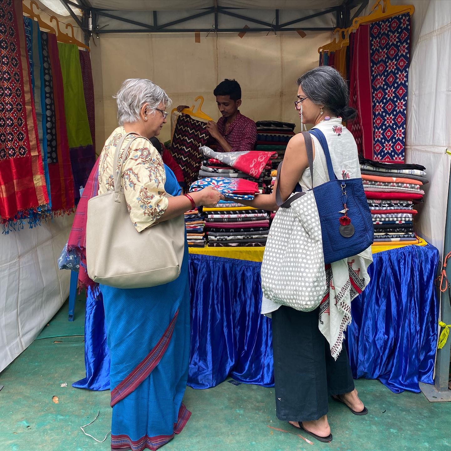 ◎お隣アンドラ・プラデーシュ州のイカット(かすり)の店では、いつものように、ダブルイカット(経緯絣/たてよこかすり)の質感を確かめずにはいられない。店頭に立つ女性たちの服装が、商品と調和していて美しい。