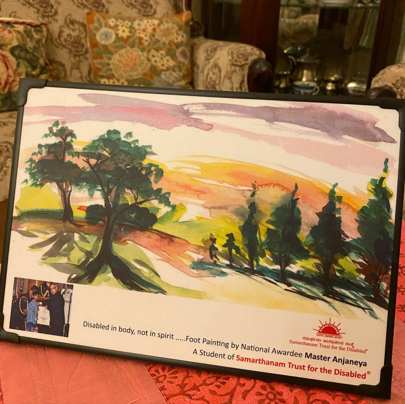 別れ際、マハンテュ氏から、贈り物をいただいた。同団体に属する両腕のない少年が、足で描いた水彩画。のびのびと自由に、優しげな風景画だ。