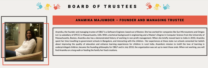 貧困層子女への英語教育を支援する慈善団体。OBLFの創始者であるアナミカと坂田が出会ったのは、2012年2月、ミューズ・クリエイションを始める前のこと。アッサム出身の彼女は米国ボストンの大学を卒業後、現地でソフトウエア・エンジニアリングの仕事をしていたが、2010年、夫と二人の息子とともにバンガロールへ移住していた。本業の傍ら、彼女は貧困層の子どもらに英語やコンピュータ教育の支援をしたいとの思いから、同団体を立ち上げ、当初は自ら、僻村の学校へ通い、教鞭をとっていた。彼女は数年後に再び家族で米国に戻ったが、現在はルビーという女性が運営を担っており、支援の枠は年々、拡大している。なお、ミューズ・チャリティバザールでは毎年ブースを提供。坂田の夫(ARVIND MALHAN)は、2014年に同団体の役員となり、大企業からの寄付金を調達、ファンドレイジングにも貢献している。なお、下部に添付している西日本新聞の記事は、2012年に寄稿したものだ。(2019年4月)