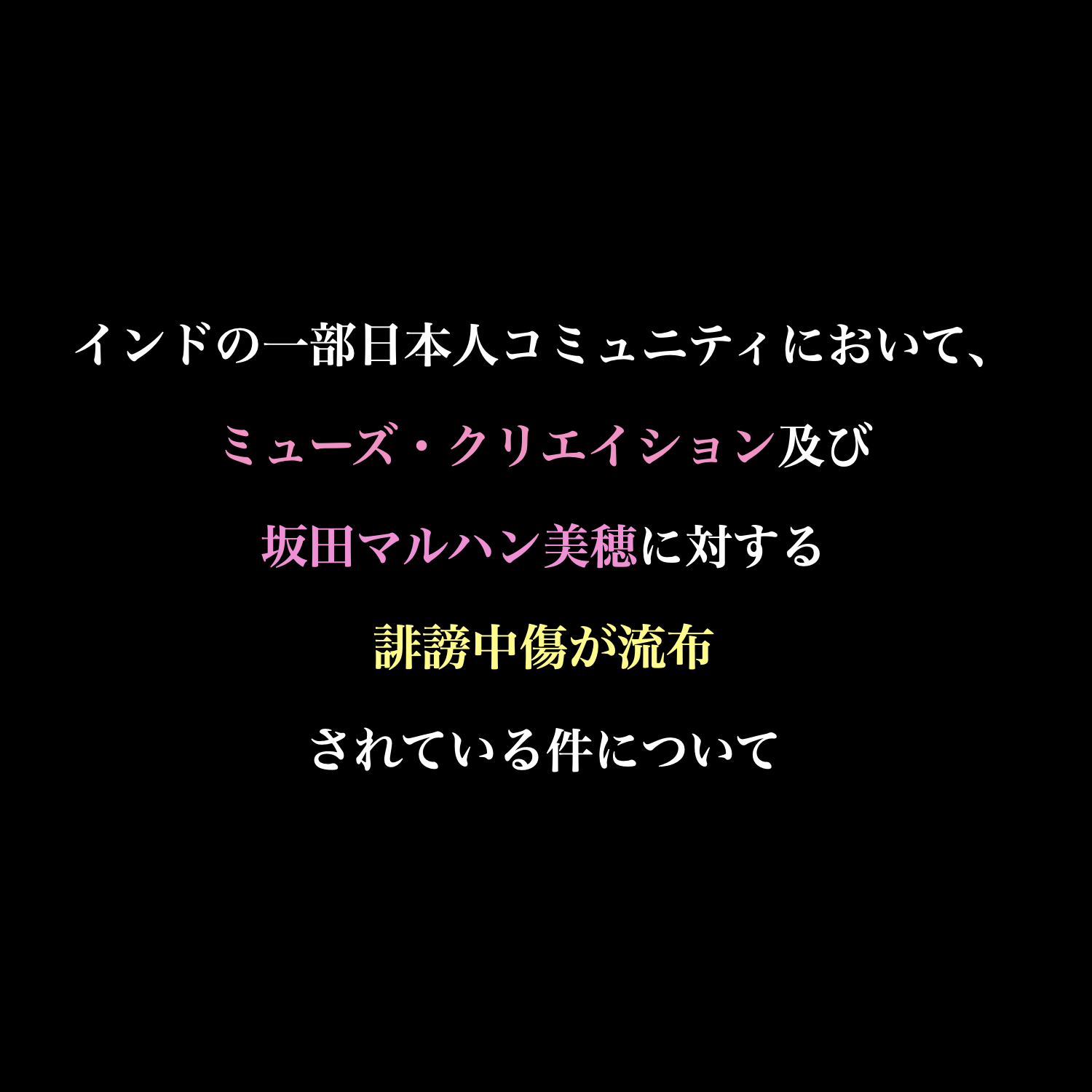 2022年初頭より、坂田マルハン美穂の仕事や生き方に関する中傷が、バンガロールの日本人コミュニティの一部にて流布されてきた。発信源となる人物(バンガロール在住日本人男性/以降A氏)は、数年に亘りミューズ・クリエイションに在籍していた上、拙宅にも幾度となく訪れるなど個人的な交流があったことから、当初は彼の非礼な言動に困惑した。しかし、ロックダウンなどの影響で、精神的に不安定なのかもしれないと考え、問いただすことはなかった。