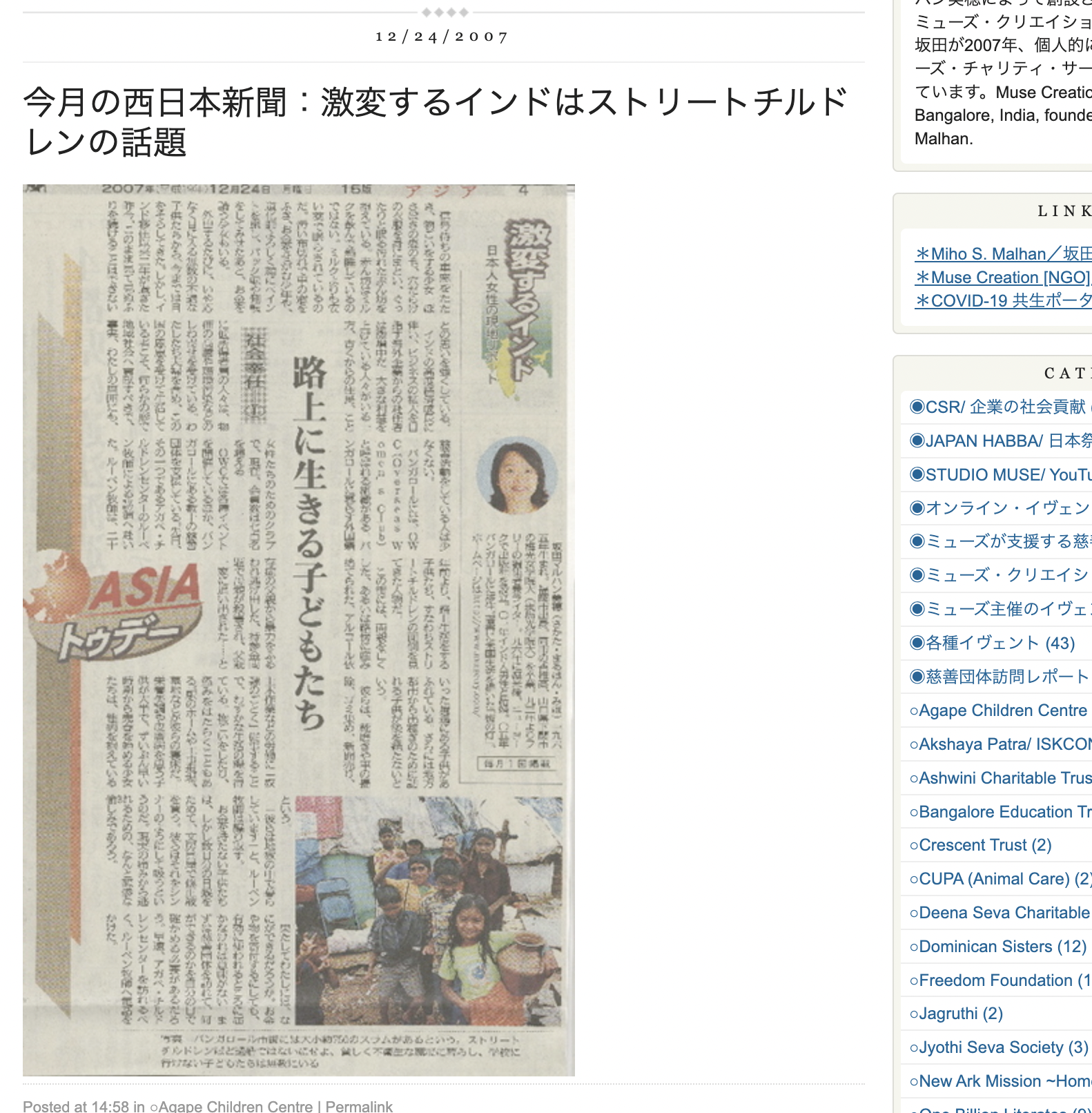 ◎2005年11月/坂田マルハン美穂は米国よりバンガロールに移住。思うところあり一人で社会貢献活動を開始。仕事の傍ら、不定期でチャリティティーパーティやセミナーを開き、寄付金を慈善団体に届け始める。