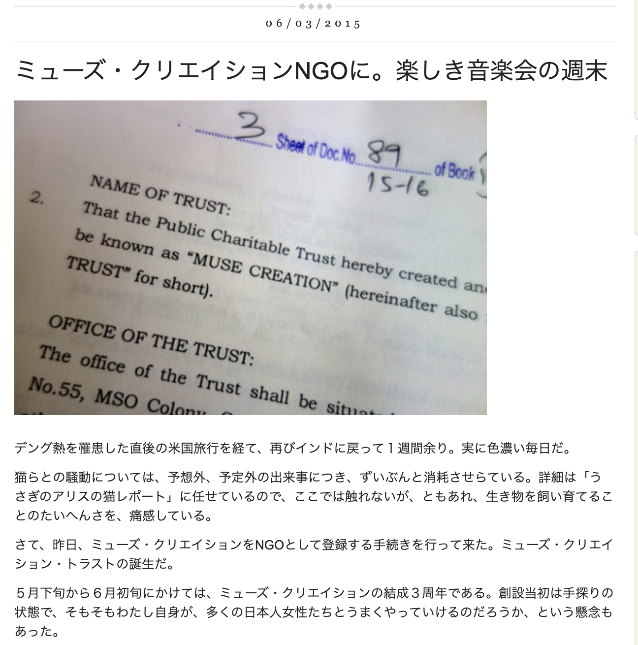 ◎2015年7月/ミューズ・クリエイションをCharitable Trust (NGO)として申請。役員はMiho Sakata, Arvind Malhan。