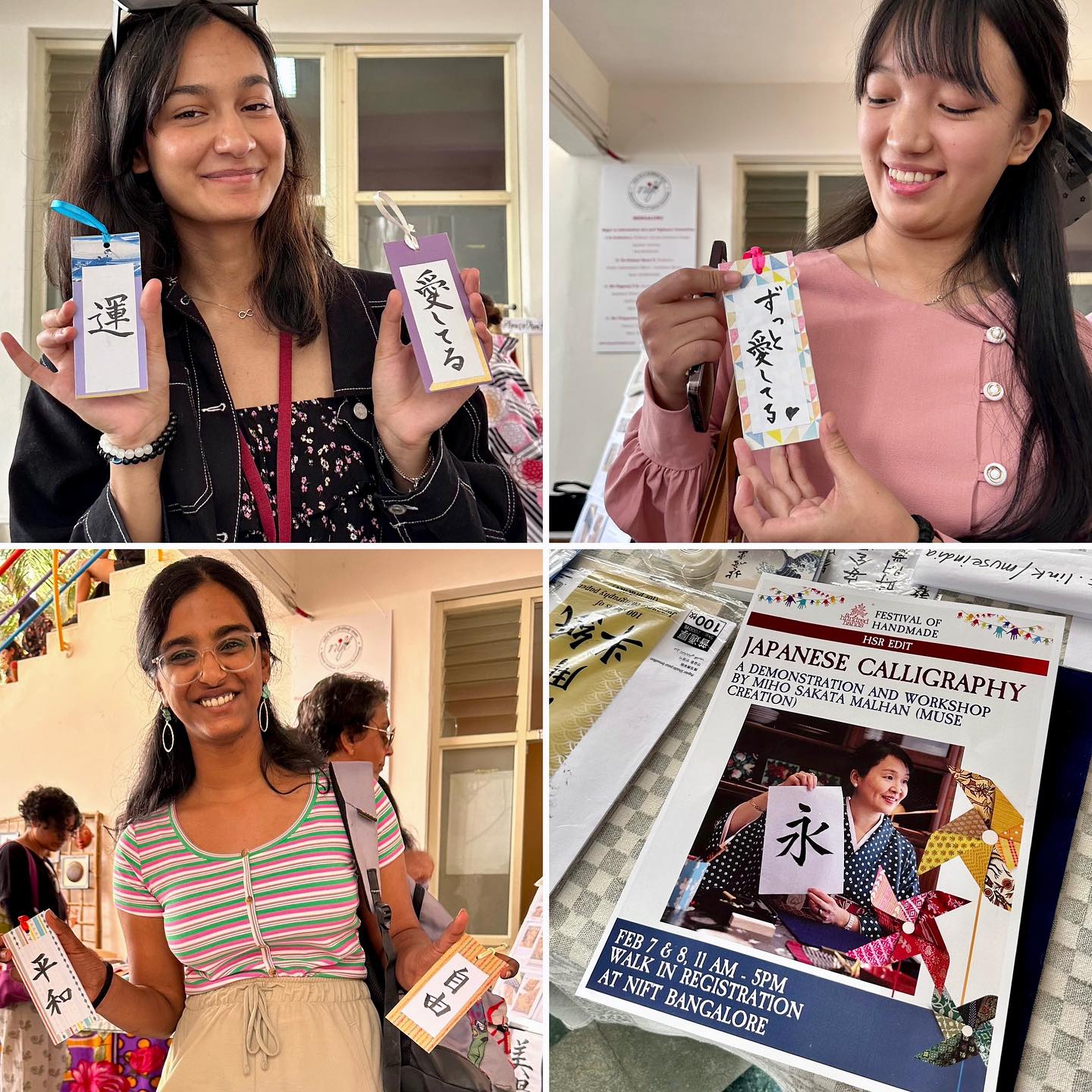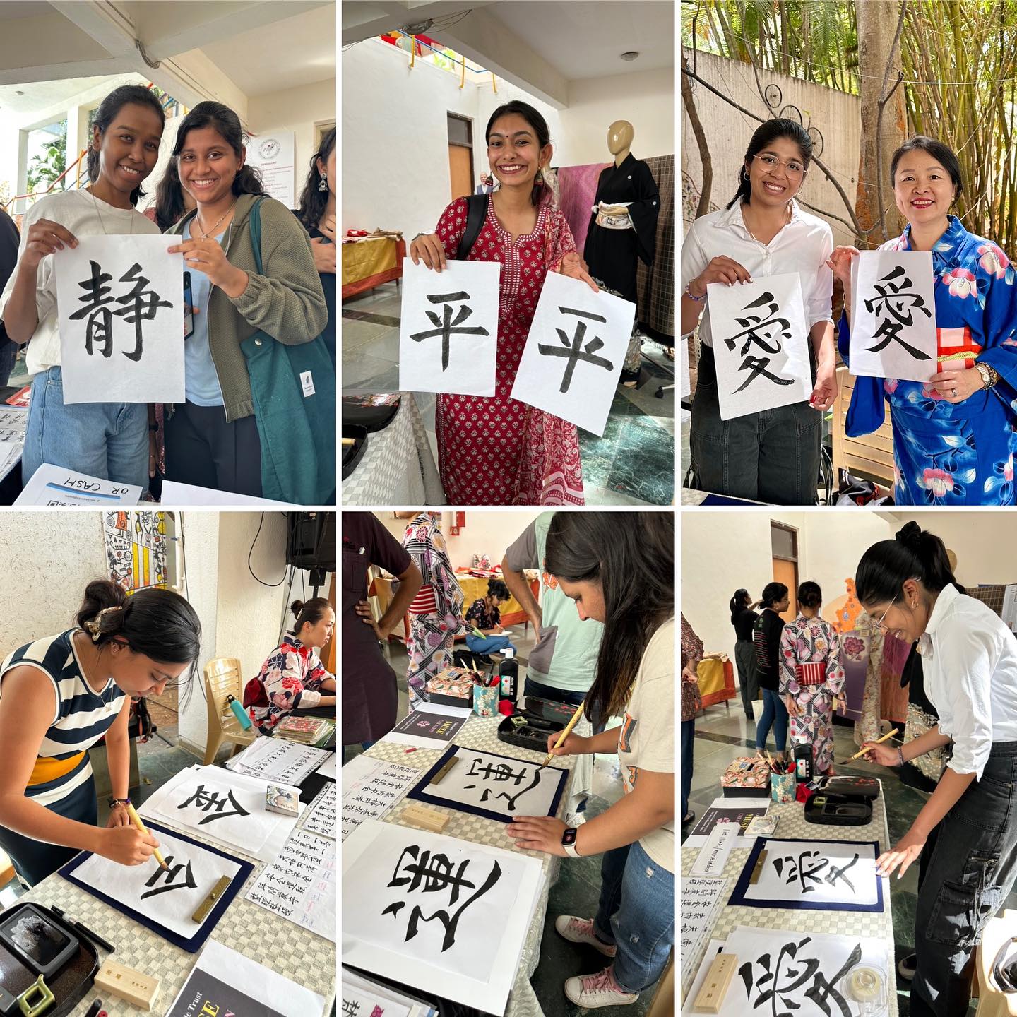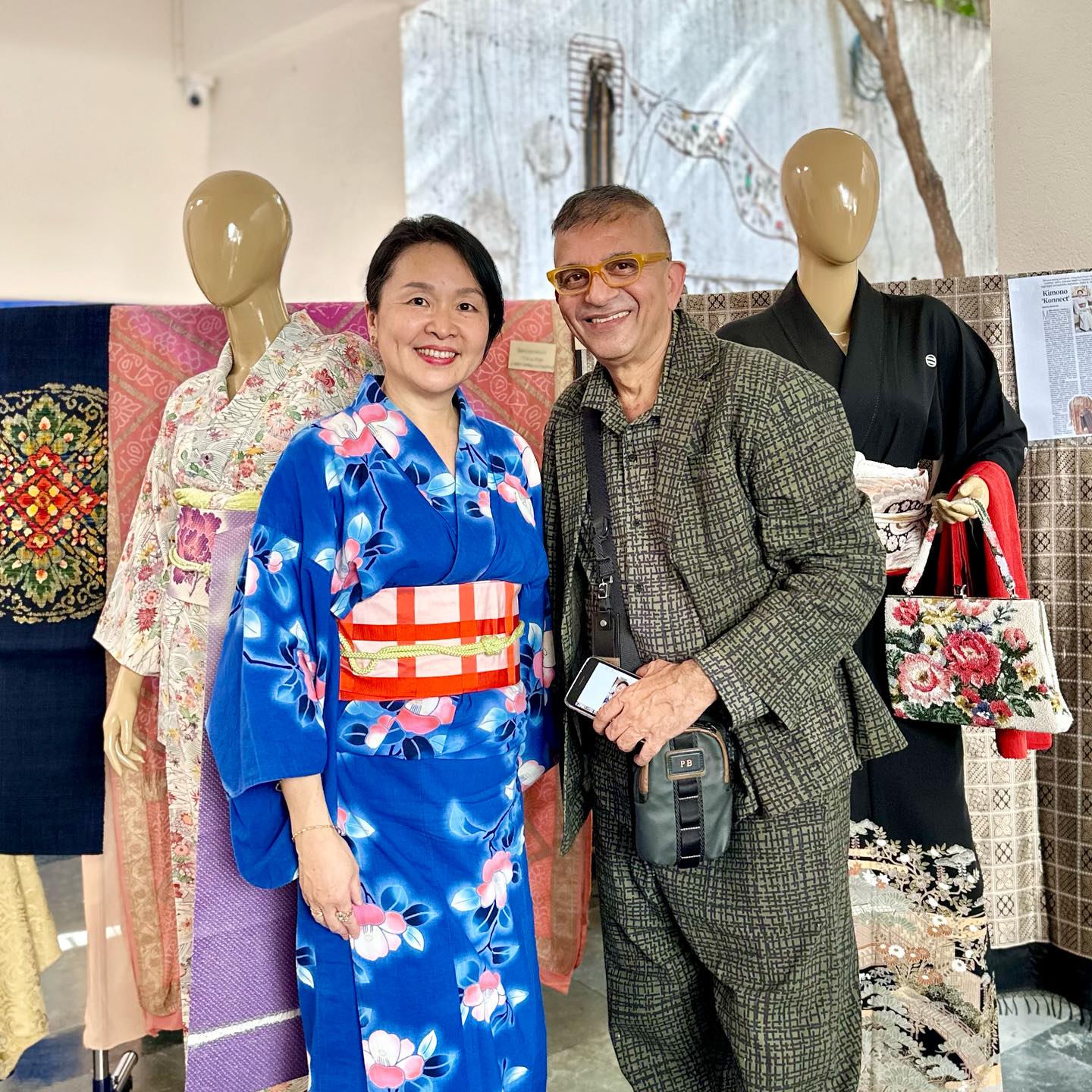 せっかくの機会。他の日本の方々にも協力してほしい。ミューズ・クリエイションのWhatsAppコミュニティにて有志を募ったところ、1日目に5名、2日目に2名が参加可能ということだったので、書道や折り紙のデモンストレーションも実施することにした。着物を展示する都合上、外のテントではなく、できれば建物内で……とお願いしたのが幸いした。Mala の計らいにより、広めのスペースを提供していただけたので、マネキン・ガールズ2名、およびポールなども準備する。テキスタイルの展示は「立体的」な方が人目をひくがゆえ。