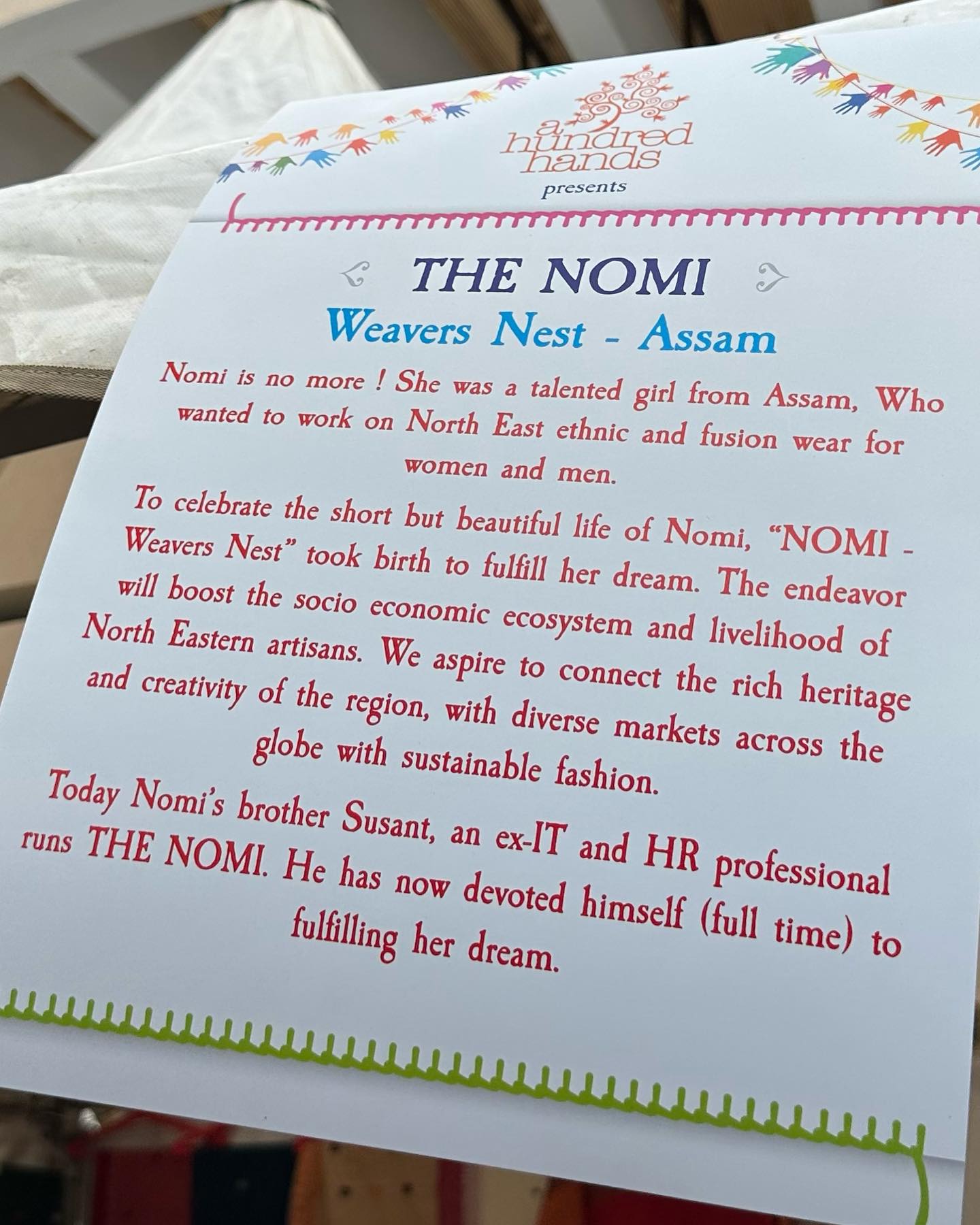 北東インドのアッサム州に暮らし、北東インドのテキスタイルをはじめとする伝統工芸品をライフワークにしたいと願っていたNOMI。彼女の他界後、兄弟のSusantが、自分の仕事を辞めて、彼女の遺志を引き継いだのだという。……帰宅後、この写真の文章を読み、胸を打たれた。